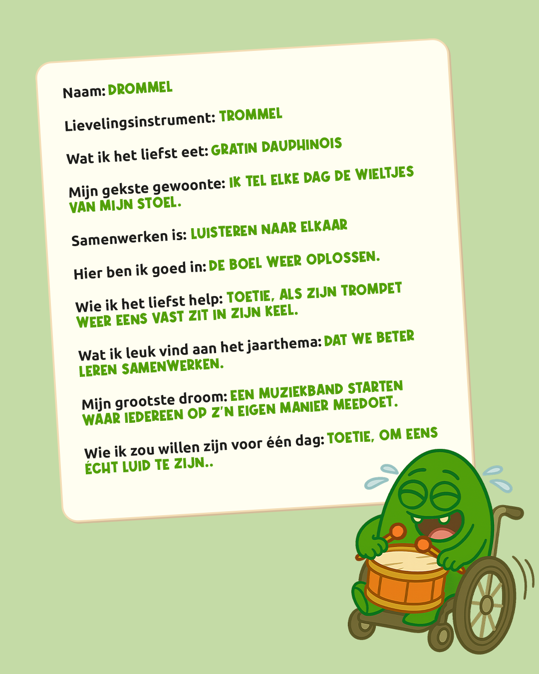 Bij Jeugd Rode Kruis geloven we dat je samen meer bereikt dan alleen. Daarom zetten we dit werkjaar in op teamspirit, samenwerking en het bundelen van krachten, binnen én buiten onze eigen werking. Net zoals muzikanten elk hun eigen instrument bespelen, maar samen een orkest vormen dat indrukwekkende muziek maakt, geloven wij dat samenwerken onze werking versterkt en nog mooier maakt. Met de vriendjes Moffel, Drommel en Toetie willen we onze jeugdkernen inspireren om samen te werken.